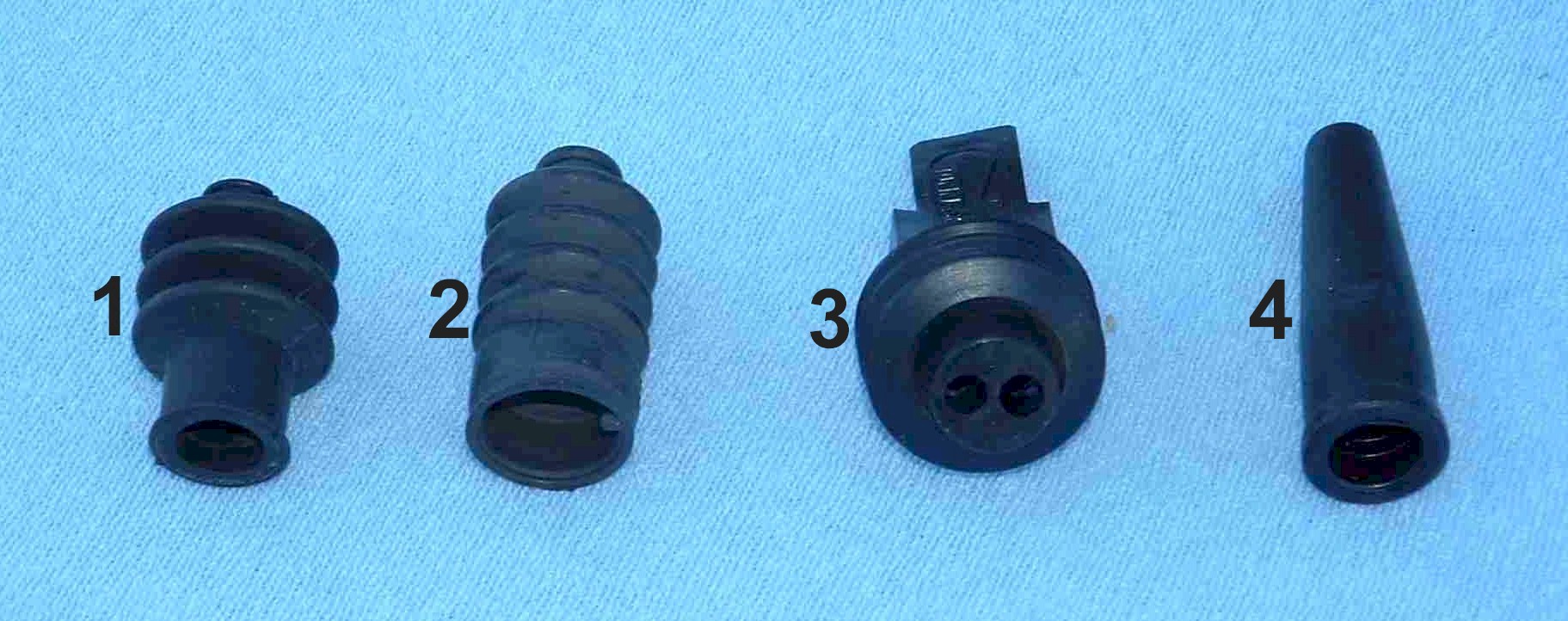 Rubber cover for Brembo brake switches (#1, #2). Rubber cover for small brake switches and electrical connections (#3, #4) Rubber cap long for choke and throttle cables (#5). Rubber cap short for choke and throttle cables (#6).
